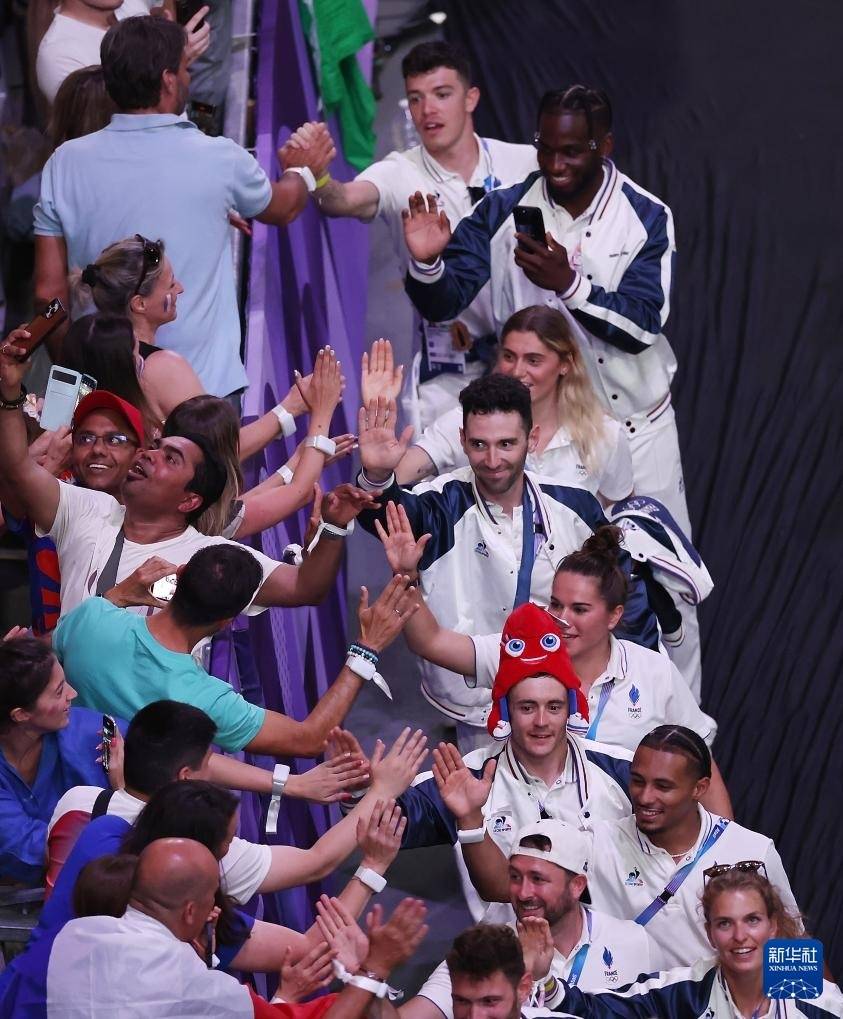 8月11日,法国体育代表团(右)在闭幕式上与观众互动。