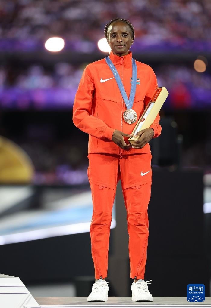 8月11日,女子马拉松季军肯尼亚选手海伦·奥比里在闭幕式举行的颁奖仪式上。