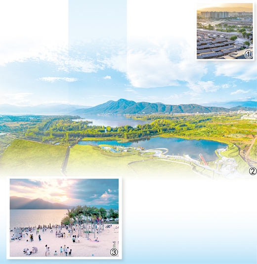 图③:游客在邛海金鳞沙滩上游玩。