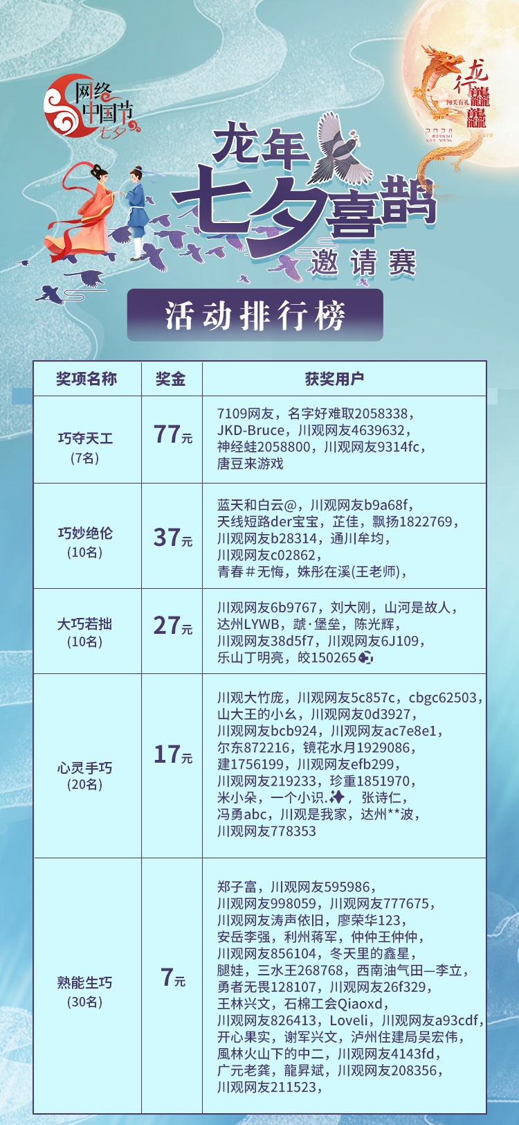 本次“龙年七夕喜鹊邀请赛”活动积分按比例计入2024年“网络中国节”龙行龘龘闯关有礼活动总排行榜。待今年重阳节活动结束后,将对总排行榜排位靠前的用户作出奖励。