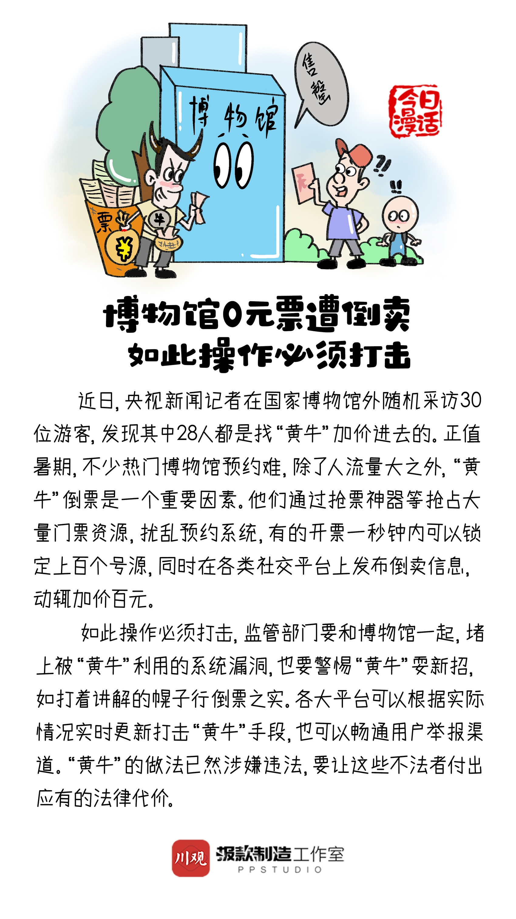 近日,央视新闻记者在国家博物馆外随机采访30位游客,发现其中28人都是找“黄牛”加价进去的。暑期不少热门博物馆预约难,“黄牛”倒票是一个重要因素。对此,你怎么看?你遭遇过博物馆抢票难吗?