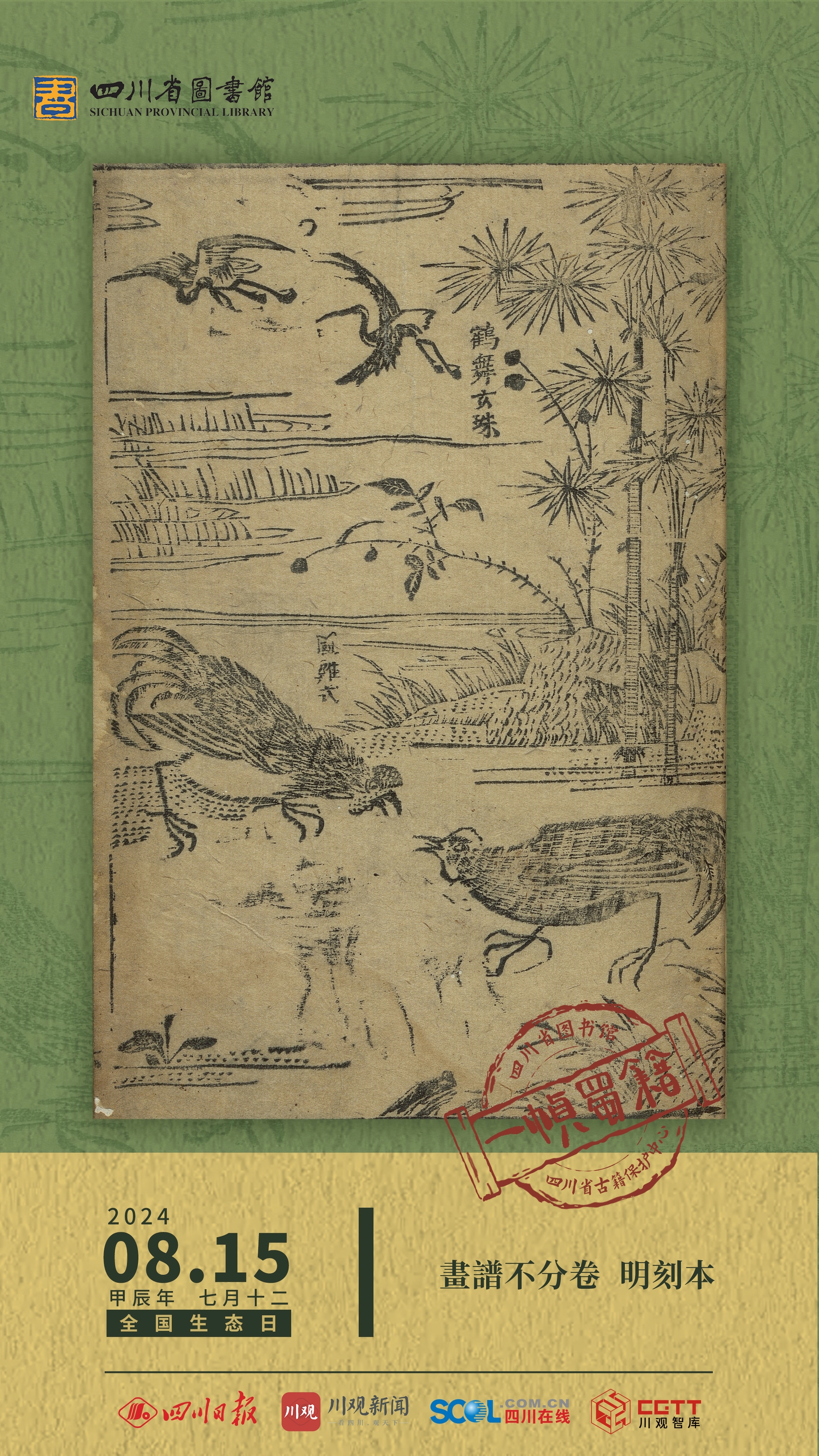 8月15日,一帧蜀籍号召大家走进全国生态日,提高生态环境保护的社会意识,积极保护生态环境、爱护地球,做地球的“绿色守护者”。海报所选用图为画谱不分卷,明刻本。