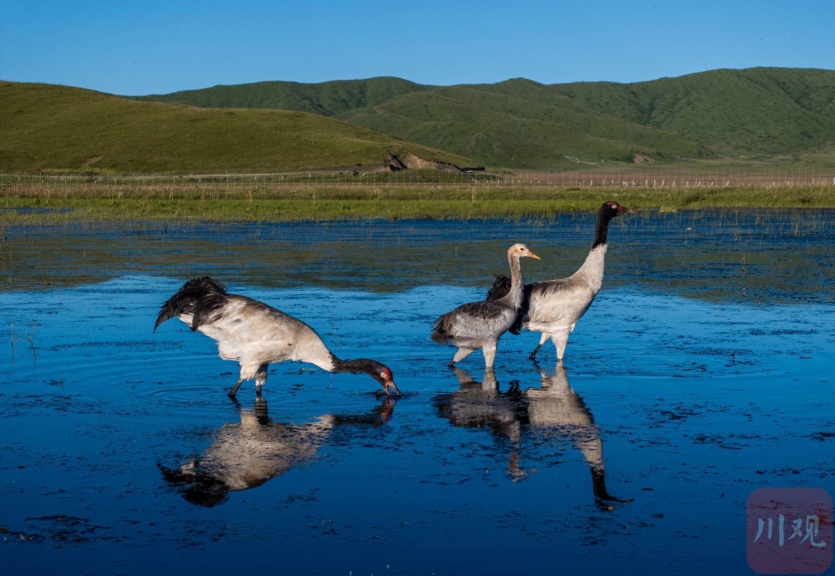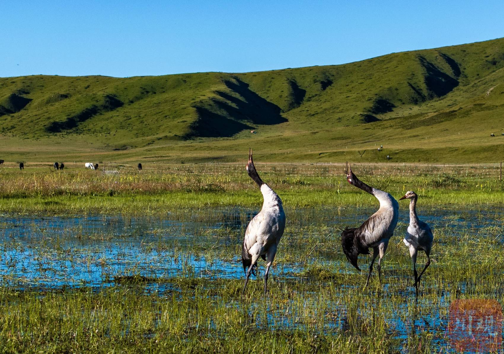 8月13日,阿坝州红原县的嘎曲河流域湿地中,夕阳下,黑颈鹤“一家三口”正在觅食。今年出生的黑颈鹤幼鸟羽毛已经开始逐渐丰满,很快就可以飞翔蓝天。