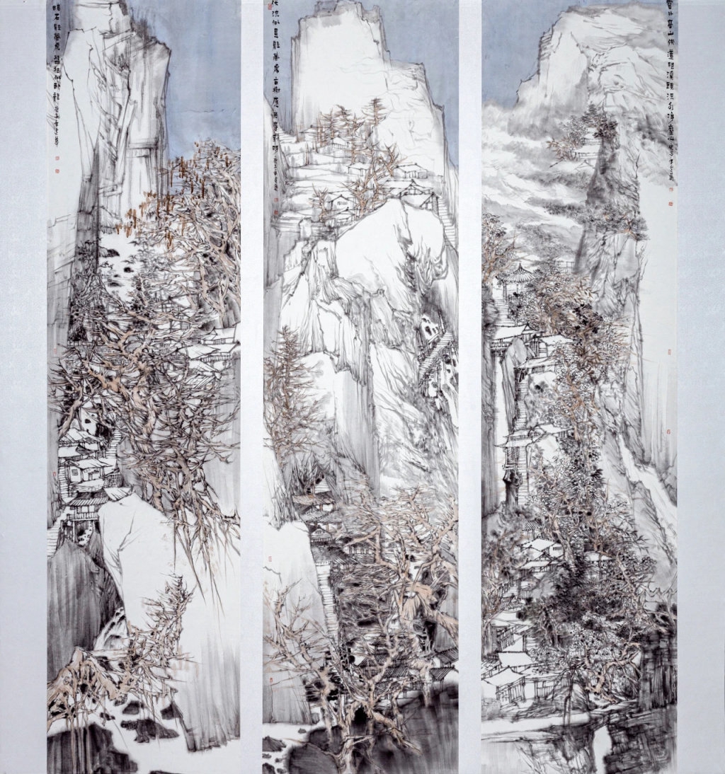 四川著名画家赵建华近年来喜作大画,崇山峻岭,繁山复水,颇为讲究。她认为,要画好中国山水画就必须到大自然中汲取营养,寻找灵感,整日蜗居画室,冥思苦想,闭门造车,虽然能取得一定的艺术效果,但终究因缺乏生活和时代气息而显得浅薄,正所谓“笔无修养不神,墨无生活不灵”。这幅《蜀道风流》正是画家践行其艺术理念的产物。作品并非对客观实景的简单再现,而是在“搜尽奇峰打草稿”之后,提取山、树、路、民居等具有代表性的蜀道元素,将眼中之景、心中之景、笔下之景熔于一炉,“观得自然之精华,化为笔墨之神灵”。