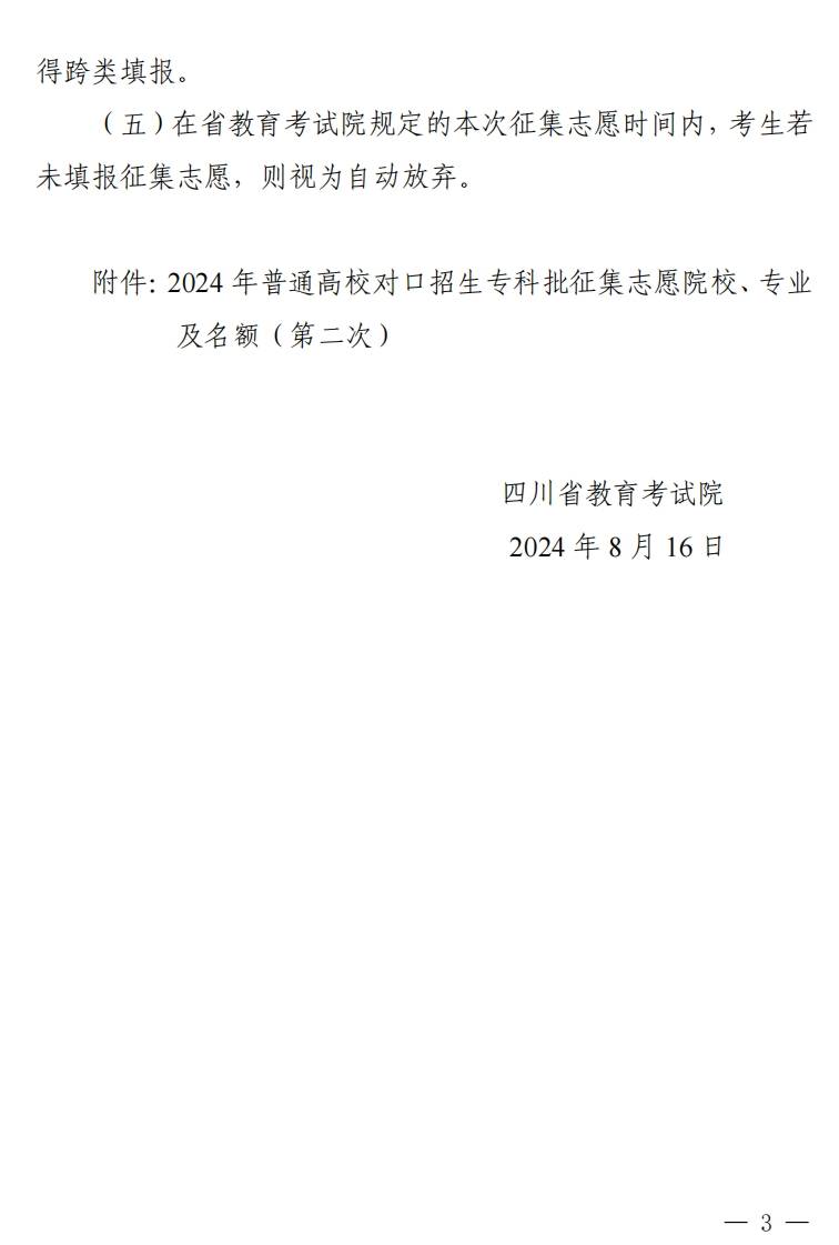 8月16日,四川省教育考试院发布关于普通高校对口招生专科批第二次征集志愿的通知: