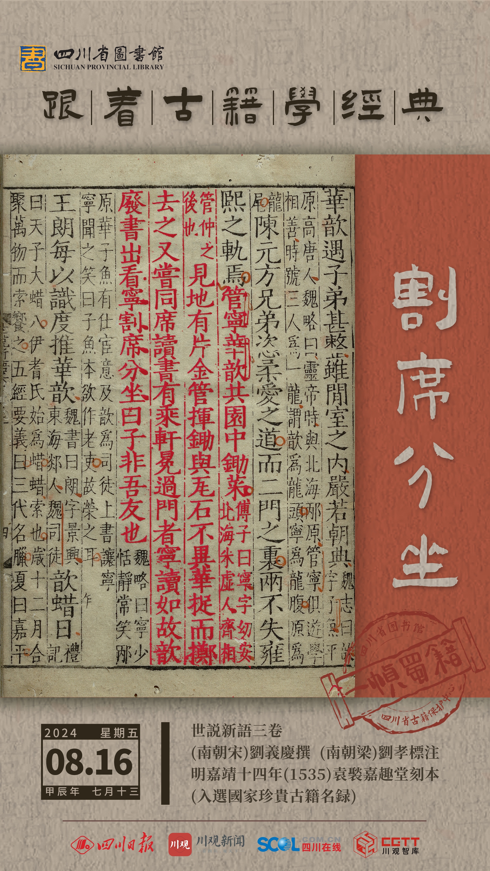 8月16日,一帧蜀籍邀你了解“割席而作”的典故。海报所选用图源于世说新语三卷(南朝宋)刘义庆撰(南朝梁)刘孝标注 明嘉靖十四年(1535)袁裴嘉趣堂刻本。