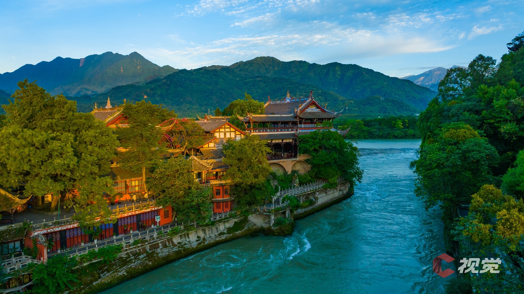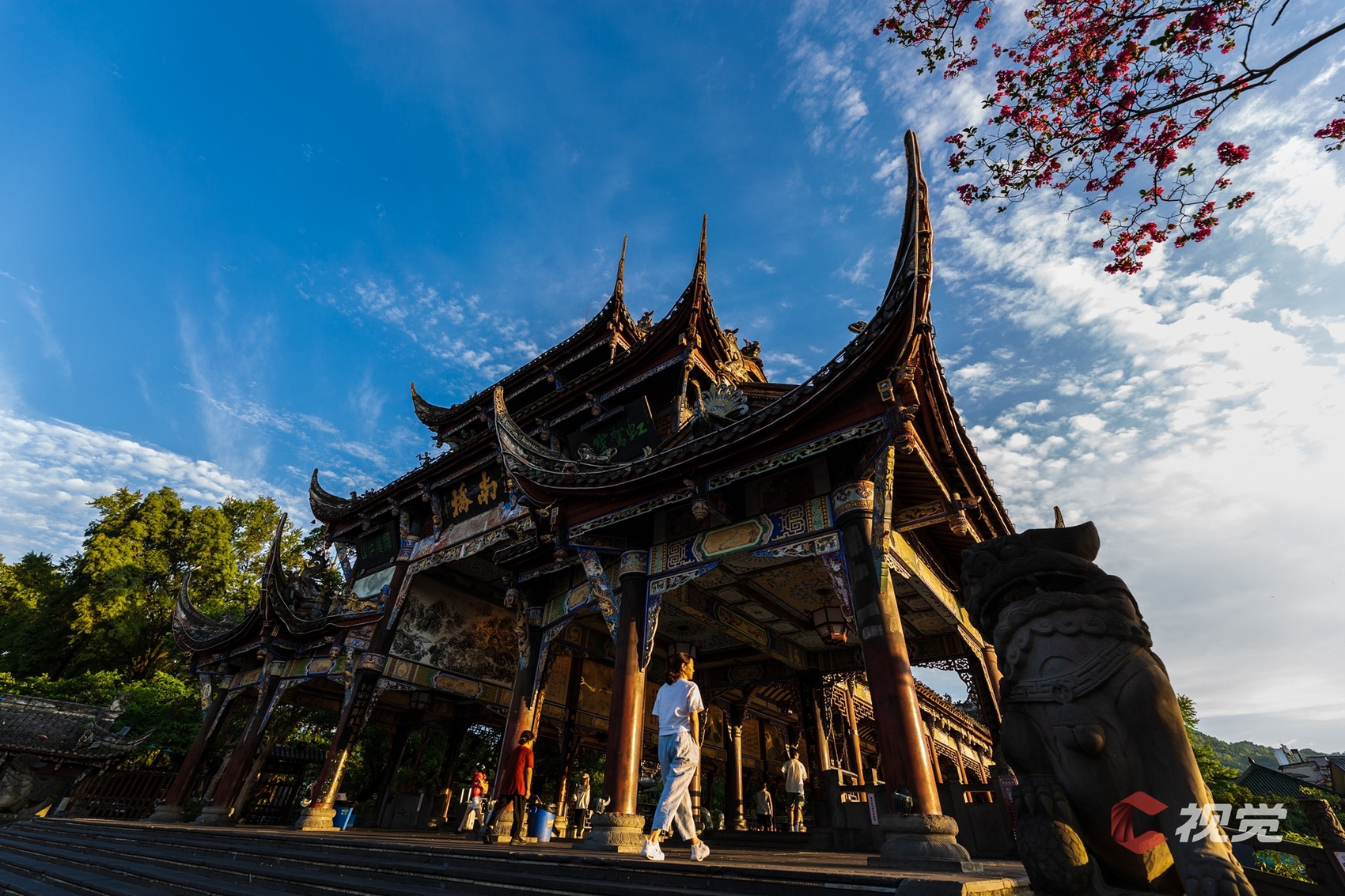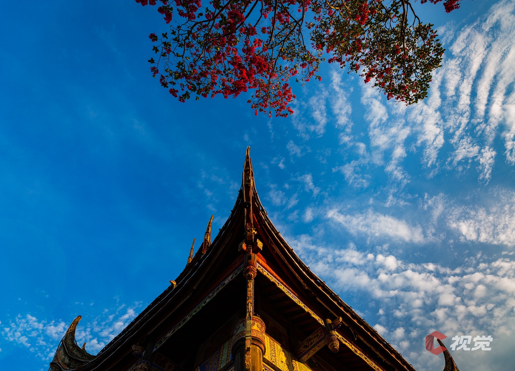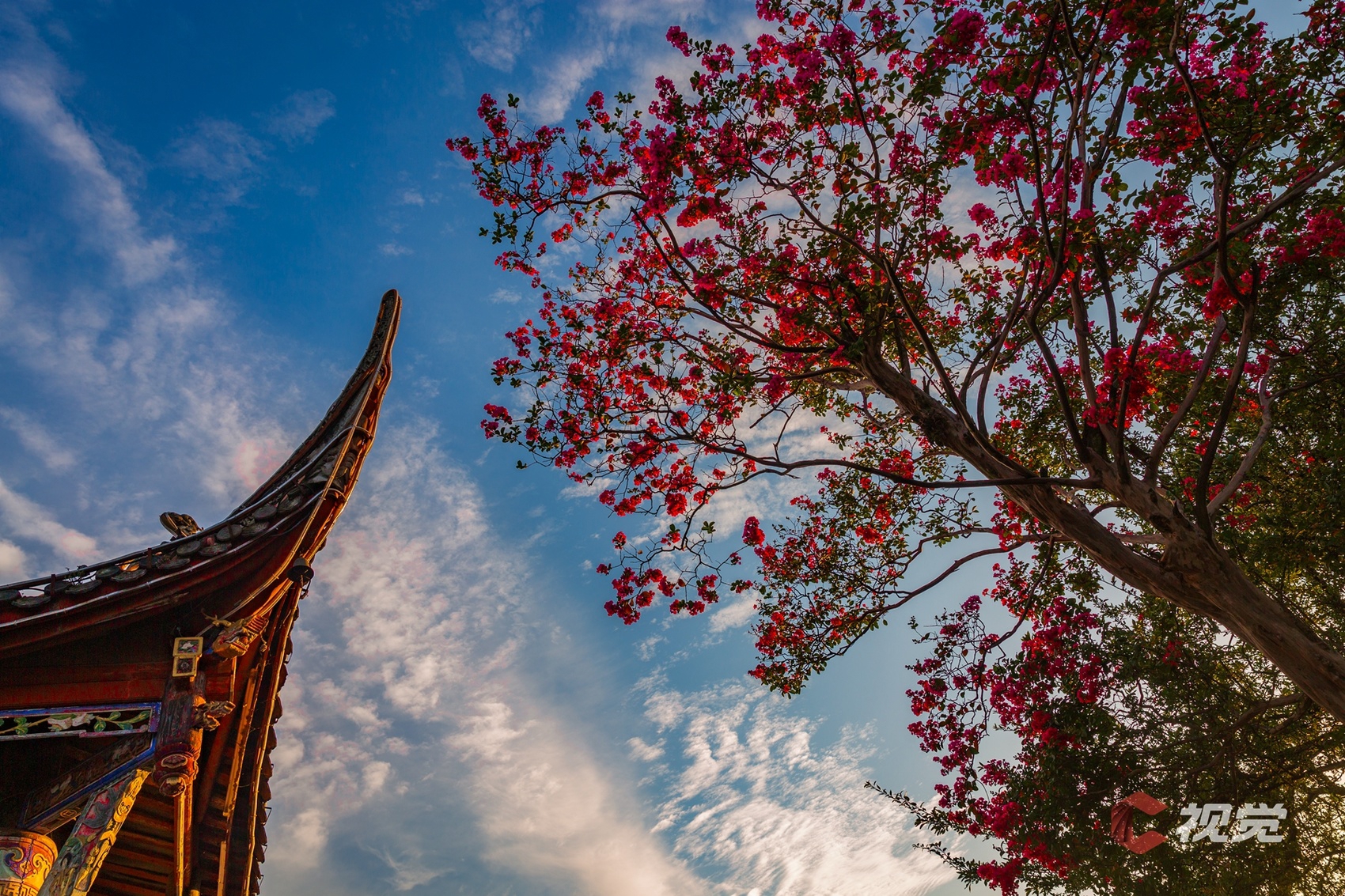 8月17日,都江堰南桥桥头,紫薇花与飞檐组成了精美的图画。
