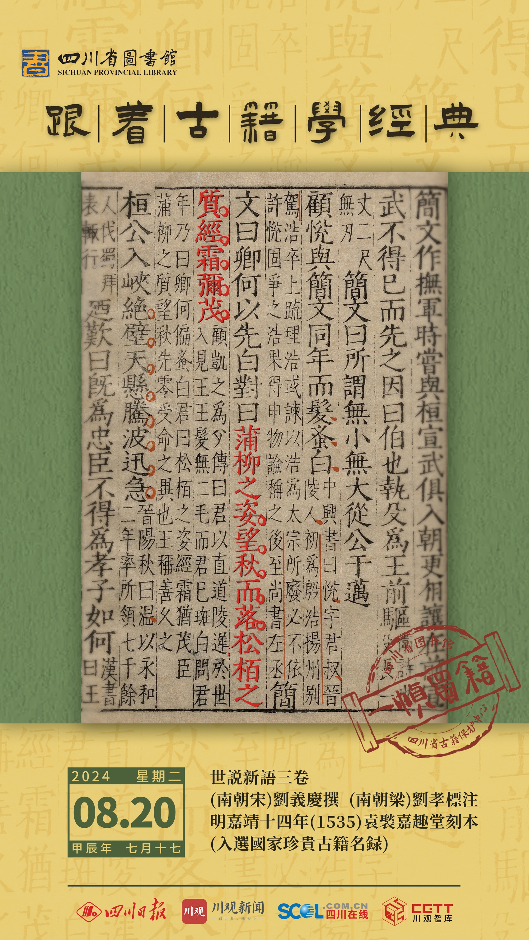 8月20日,一帧蜀籍带你继续赏读《世说新语》,海报所选用图源于世说新语三卷(南朝宋)刘义庆撰(南朝梁)刘孝标注 明嘉靖十四年(1535)袁裴嘉趣堂刻本。