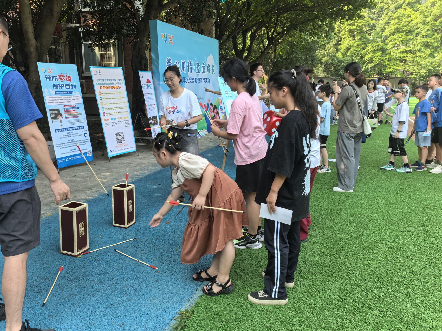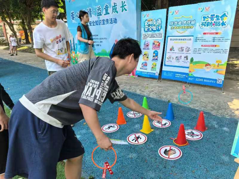 在游园会环节,多个趣味横生的游戏区通过精心设计,将安全知识巧妙地融入游戏中。孩子们在家长的陪伴下,兴奋地穿梭于各个游戏摊位之间,在玩中学,学中乐。例如,在“安全知识欢乐套圈”游戏中,孩子们手持带有安全标识名称的圈环,瞄准贴有安全标识的锥桶投掷,每当套中目标时,都会兴奋地欢呼雀跃;“安全玲珑骰”则通过多样化的任务形式,如角色扮演、实物操作、快速问答等,让孩子们在游戏中体验学习的乐趣。活动现场还设置了未成年人保护知识展架,展架前人头攒动,家长们纷纷驻足阅读,与孩子们共同探讨安全知识和分享安全保护经验。