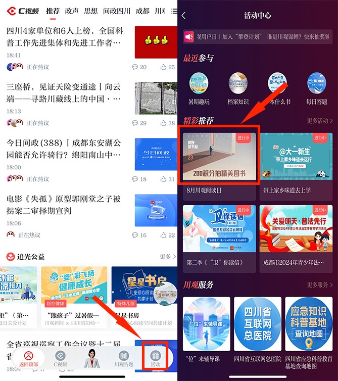 第二步:在川观新闻首页,点击右下角“活动”,进入活动中心,找到川观读书日活动图片,点击即可参与活动。