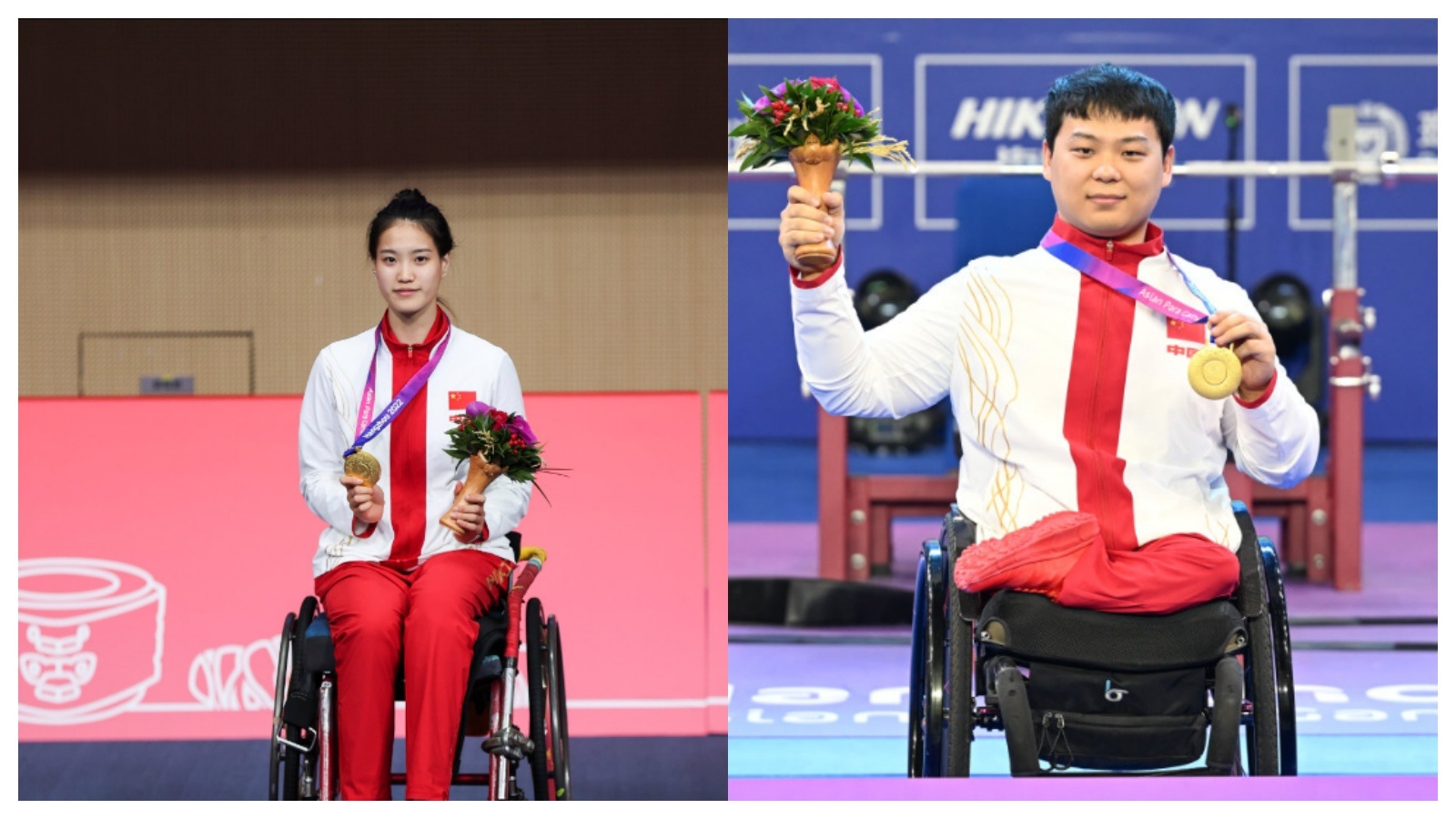 左图为2023年10月23日,中国选手辜海燕在杭州第4届亚残运会轮椅击剑项目女子花剑个人颁奖仪式上。右图为2023年10月24日,中国选手齐勇凯在杭州第4届亚残运会举重项目男子59公斤级颁奖仪式上。