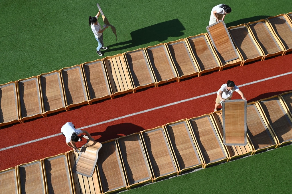 8月26日,在四川省内江市东兴区阳光幼儿园,老师们在操场清洁晾晒儿童床。