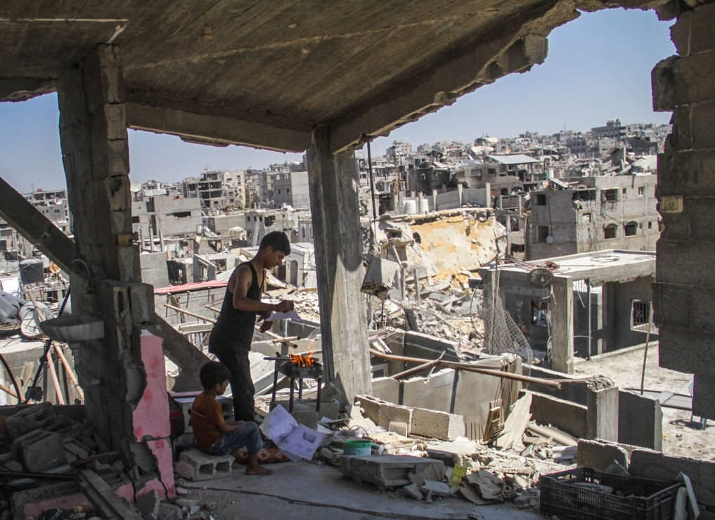 8月26日,在加沙地带北部的杰巴利耶难民营,巴勒斯坦人在一处废墟生火做饭。