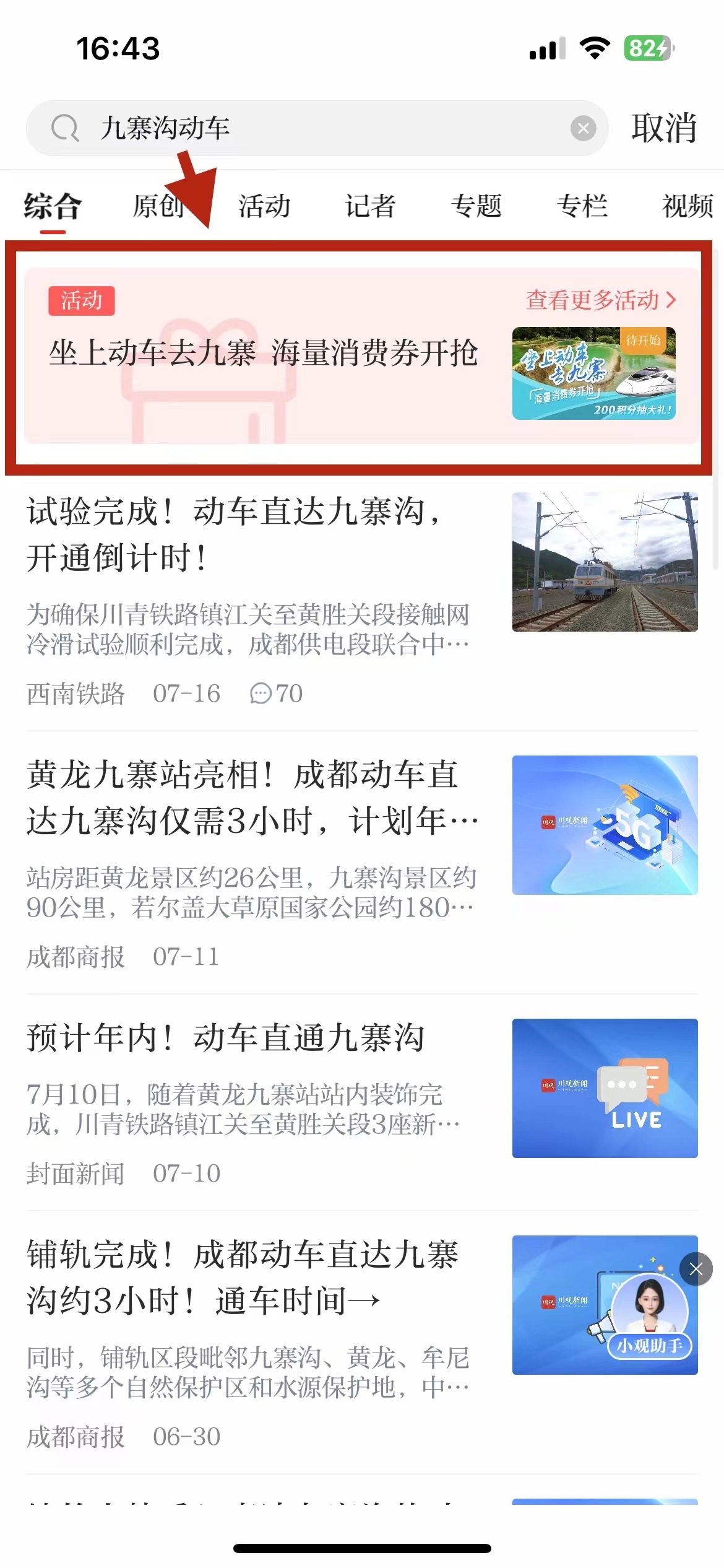 在川观新闻首页顶部搜索框输入;“九寨沟动车”,点击活动链接即可参与。