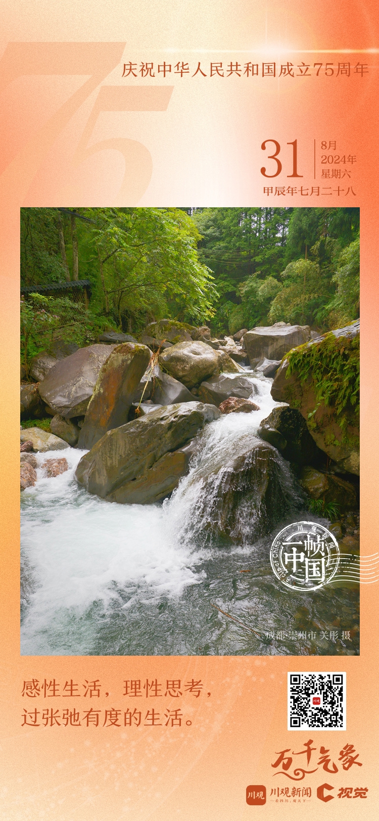 今天距离2024年国庆节还有31天,已是8月最后一天,但天气仍然炎热,川观新闻《一帧中国》带你来到成都崇州市白云沟,在绿树清溪中体验难得的清凉。