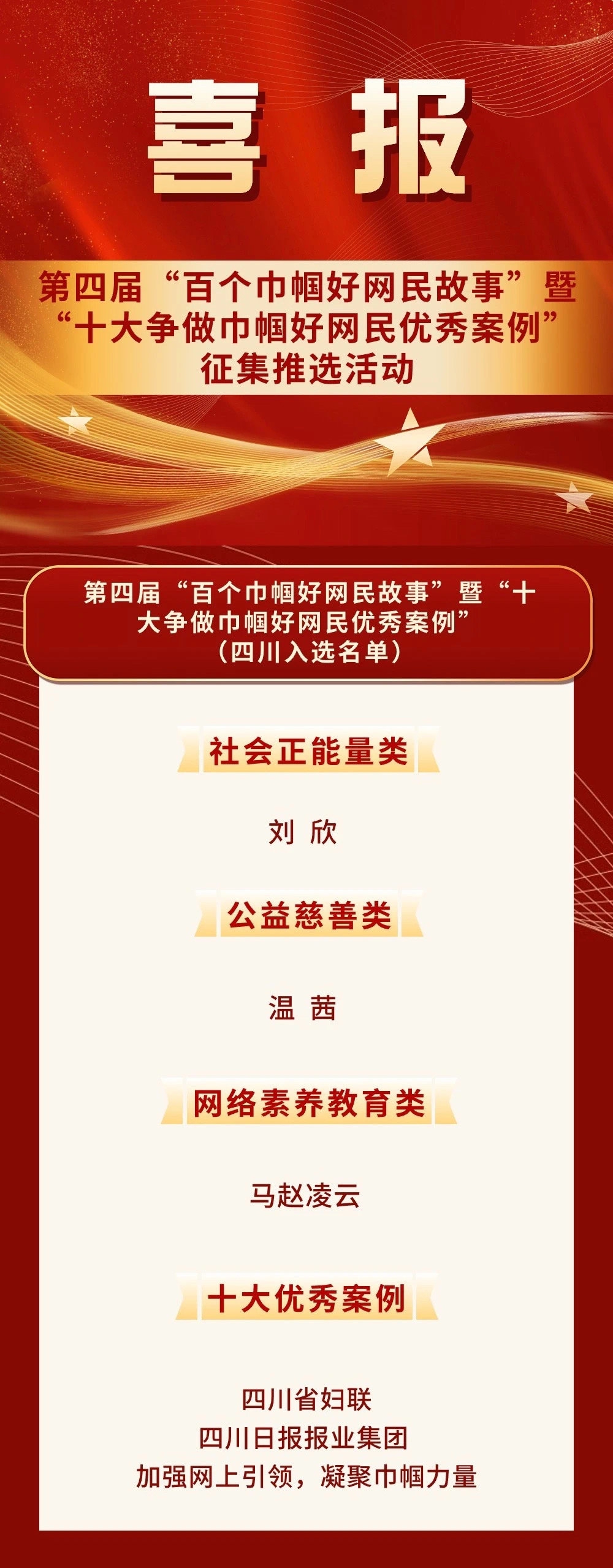 8月28日下午,在2024年中国网络文明大会网络正能量分论坛上,由全国妇联宣传部、中央网信办网络社会工作局组织开展的第四届“百个巾帼好网民故事”暨“十大争做巾帼好网民优秀案例”征集推选活动结果正式发布。由四川日报川观新闻与省妇联联合开展的“加强网上引领 凝聚巾帼力量”案例,入选“十大争做巾帼好网民优秀案例”。