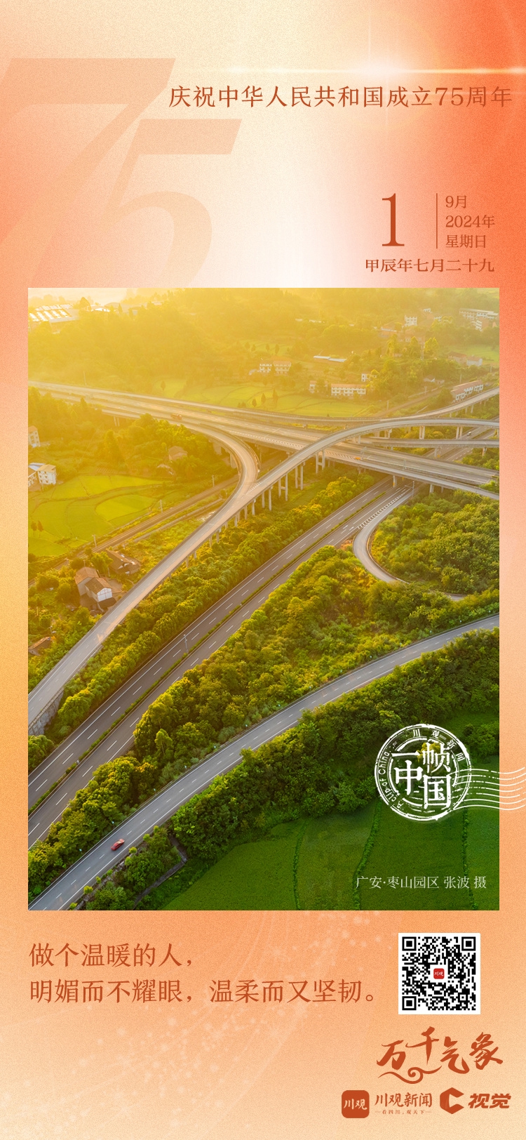 今天距离2024年国庆节还有30天,川观新闻《一帧中国》带你来到广安经开区枣山园区,俯瞰晨曦之中纵贯乡野的公路路网。