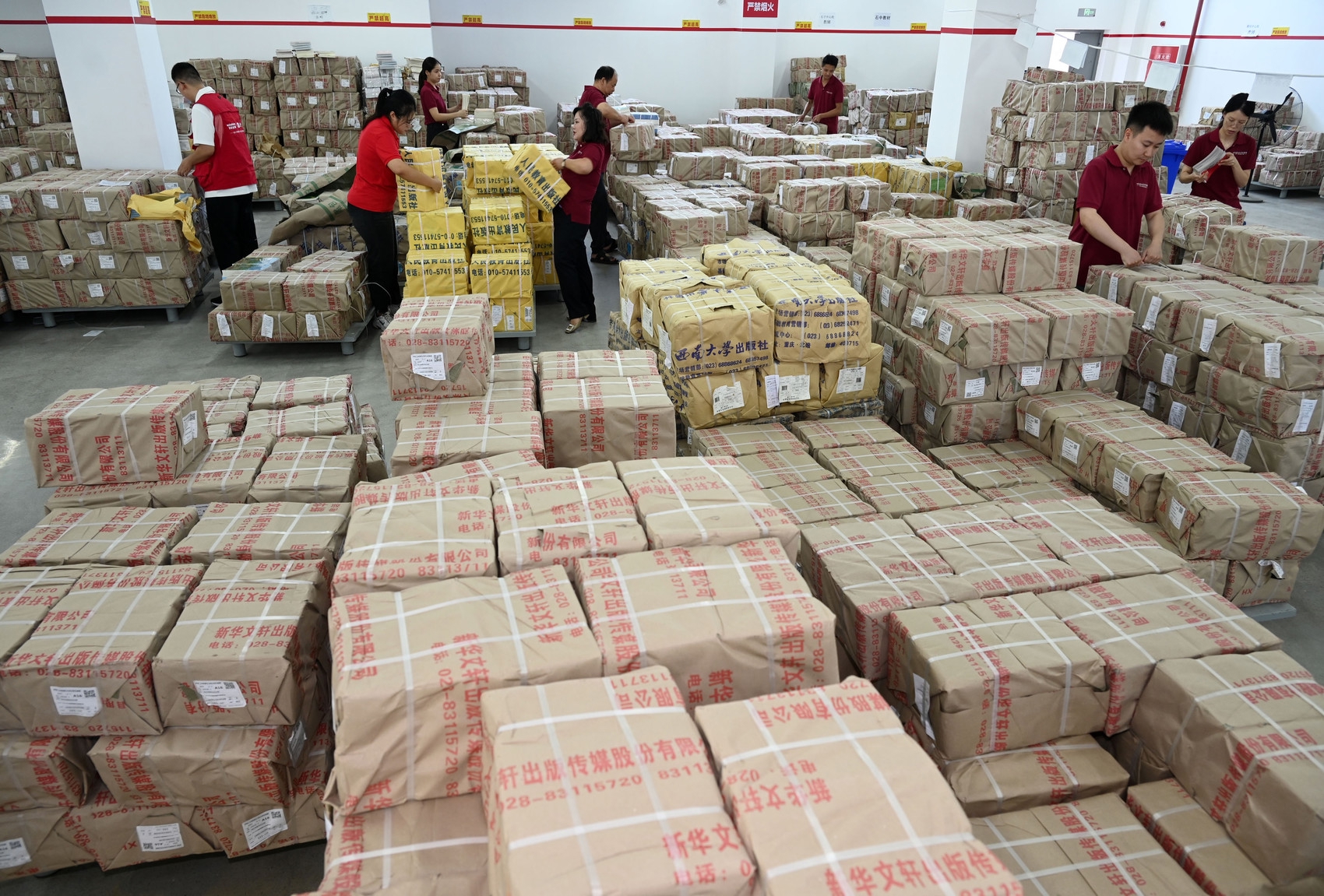 记者在多个现场看到,酷热的仓库里,叉车在密集堆放的“书山”里穿梭,工作人员有的正忙着清点数目、打印清单,按照供货需求拆包、打包……汗水湿透了衣衫。另一边,一辆辆物流车不分昼夜将包件运送到各地区,为加快收发节奏,各地区分公司员工24小时轮班,“白加黑”连轴转,做到来件随到随收货随分拣。巴中、北川、乐至、简阳、绵阳……各分公司的员工要么在清点出库的烈日下,要么在送书的路上。