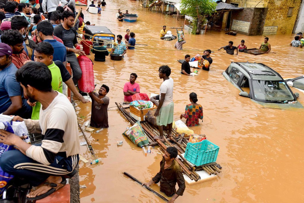 9月2日,在印度南部的维杰亚瓦达,人们登上高处躲避洪水。