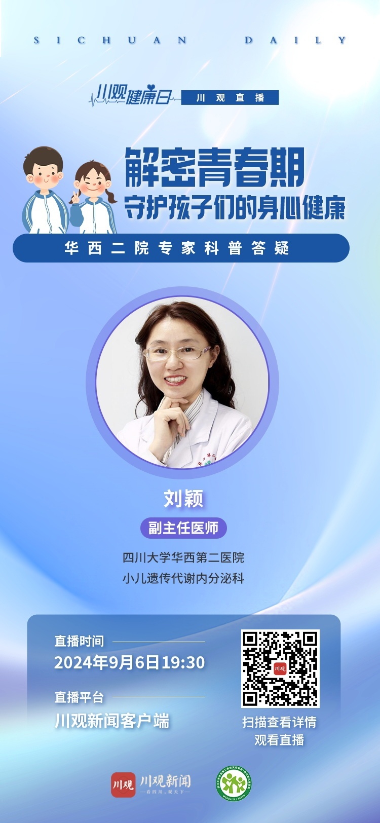 9月6日,川观新闻携手四川大学华西第二医院开展健康主题直播,邀请小儿遗传代谢内分泌科副主任医师刘颖,聚焦孩子青春期生长发育,就孩子青春期的身心健康等相关内容,为家长朋友们科普讲解,答疑解惑。