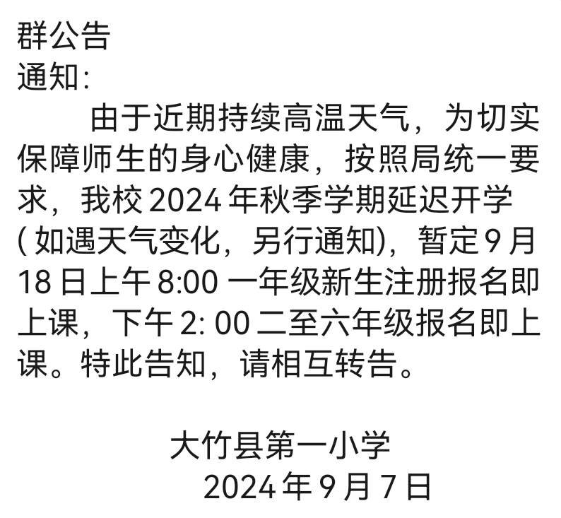 封面新闻记者了解到,除了大竹县第一小学,大竹县还有城区的三小、八小、大竹中学、大竹二中、大竹四中等中小学以及乡镇上的石河中学、清水镇中心校、庙坝中学等学校,均同步发布了再次延迟开学的通知。这些学校的通知中,有的只涉及部分年级的开学时间继续延后,有的是全校学生均继续延迟开学,但特别备注了“如遇天气变化另行通知”。与此同时,达州主城区的绝大多数公立中小学和幼儿园,以及渠县等气温较高的区县,也有不少公立中小学和幼儿园,陆续发布继续延迟开学的通知。这些学校继续延迟开学时间后,正式上课的时间基本上都定在9月18日。