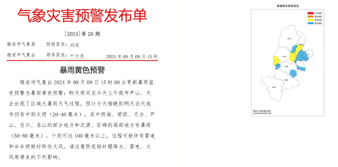 9月9日15时40分,四川省气象台发布暴雨蓝色预警。