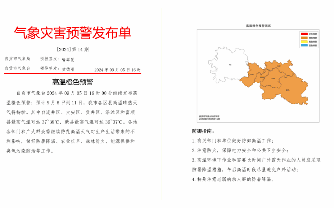 此前发布的自贡高温橙色预警,达州、广安、泸州、南充、宜宾高温黄色预警,遂宁高温蓝色预警仍在生效中。