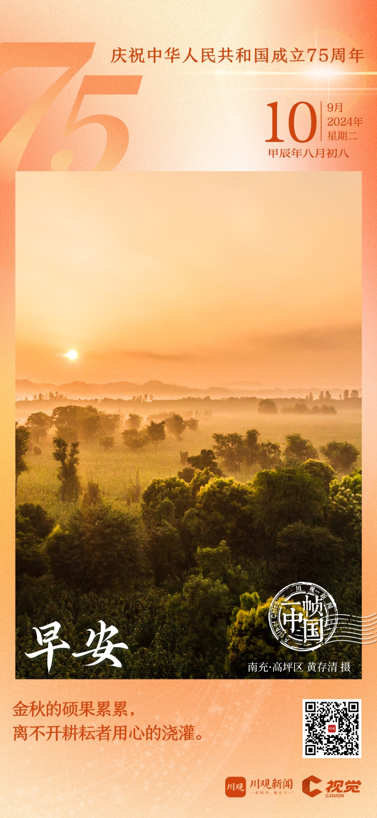 今天距离2024年国庆节还有21天,川观新闻《一帧中国》与你一起,来到南充市高坪区凤仪湾·中法农业科技园,欣赏初秋时节嘉陵江畔的田园晨曦。
