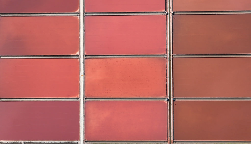 秋日里,位于天津市滨海新区的长芦汉沽盐场盐田色彩斑斓,纵横排列的盐池宛如调色板。