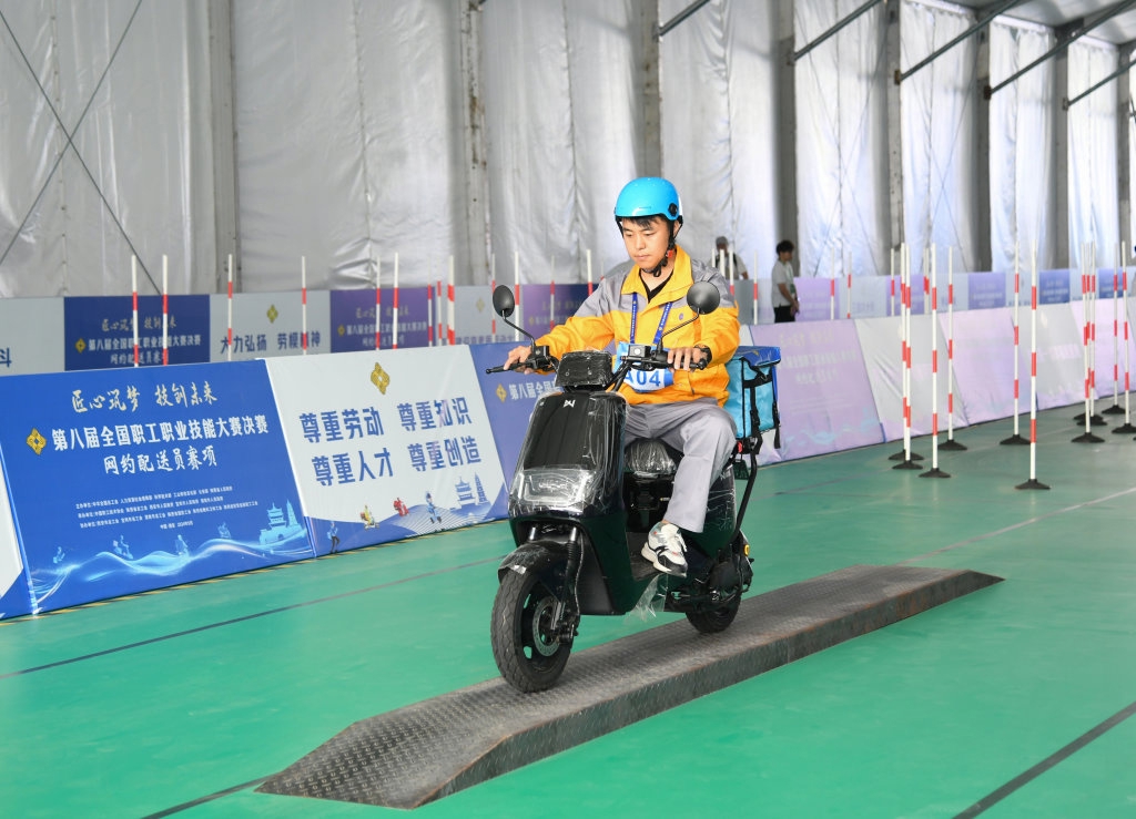 9月11日,选手在位于西安国际会展中心的比赛场地参加网约配送员工种比赛。
