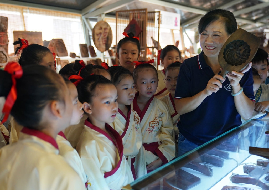 孩子们在糕饼模具体验馆里迎中秋