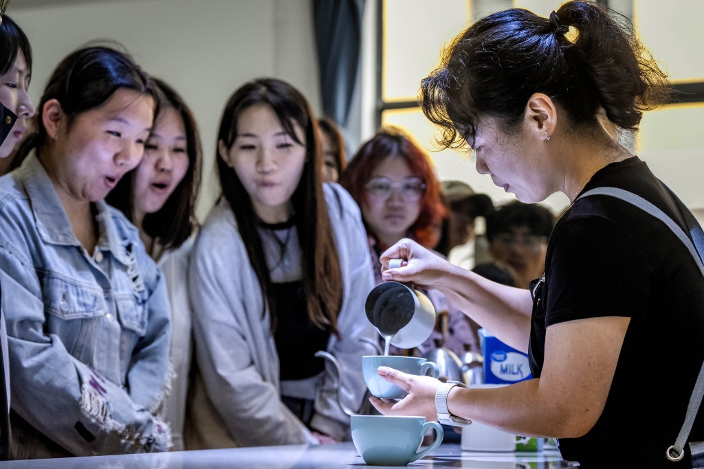 9月10日,云南农业大学热带作物学院教师黎丹妮(右)在咖啡认知课上给学生讲解咖啡拉花技巧。
