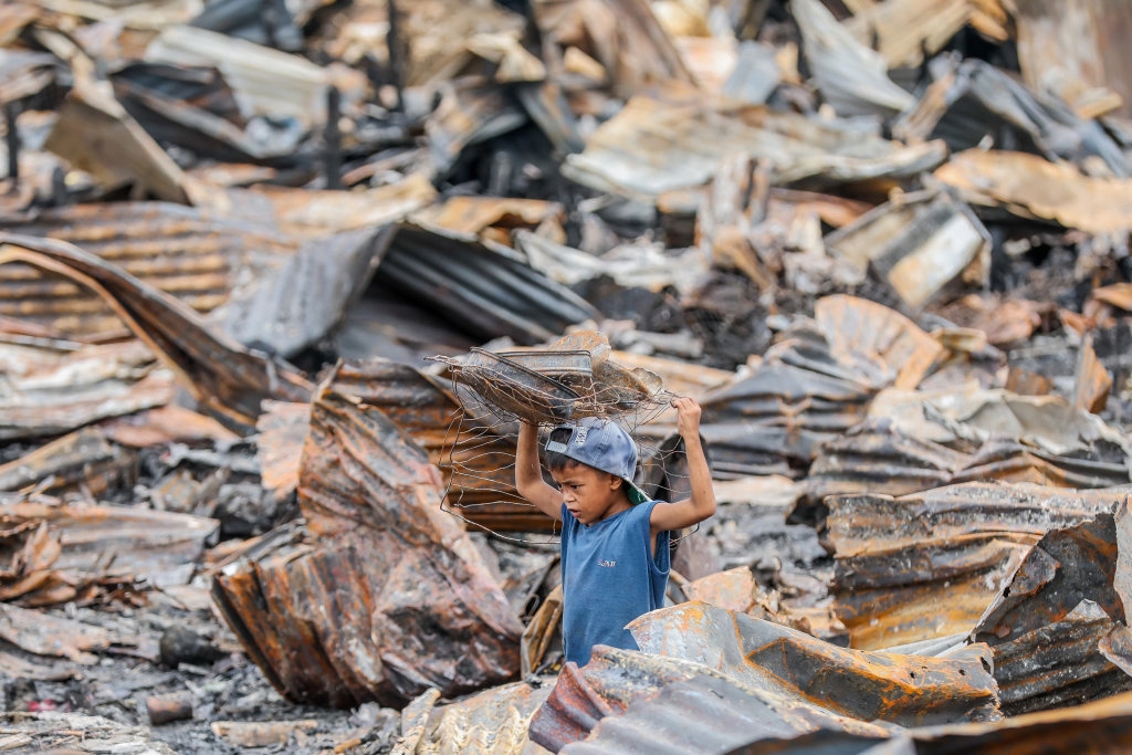 9月11日,在菲律宾甲米地省一处发生火灾的棚户区,一名男孩在废墟中搬运可用物品。