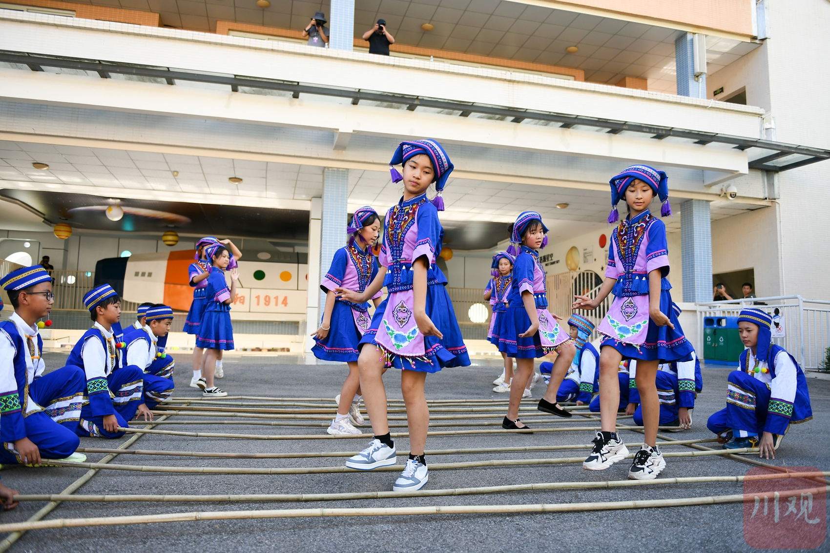 9月11日,宁南县朝阳小学舞蹈社团的学生们表演布依族“竹竿舞”。