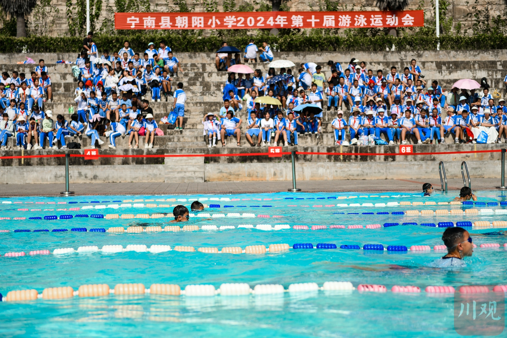 9月11日,宁南县朝阳小学2024年第十届游泳运动会现场。