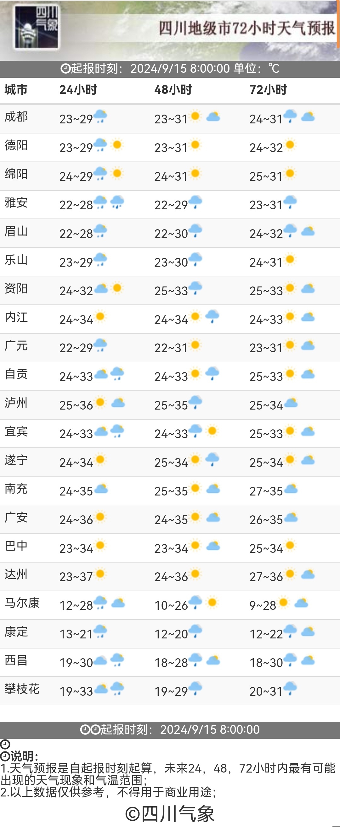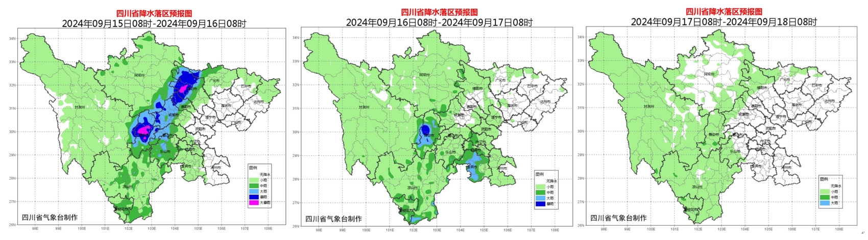 四川省气象台预计,9月15 日至17日,盆地西部多云间阴,15日至16日多阵雨或雷雨,局部有大雨到暴雨;川西高原和攀西地区多阵雨或雷雨,局部中雨。