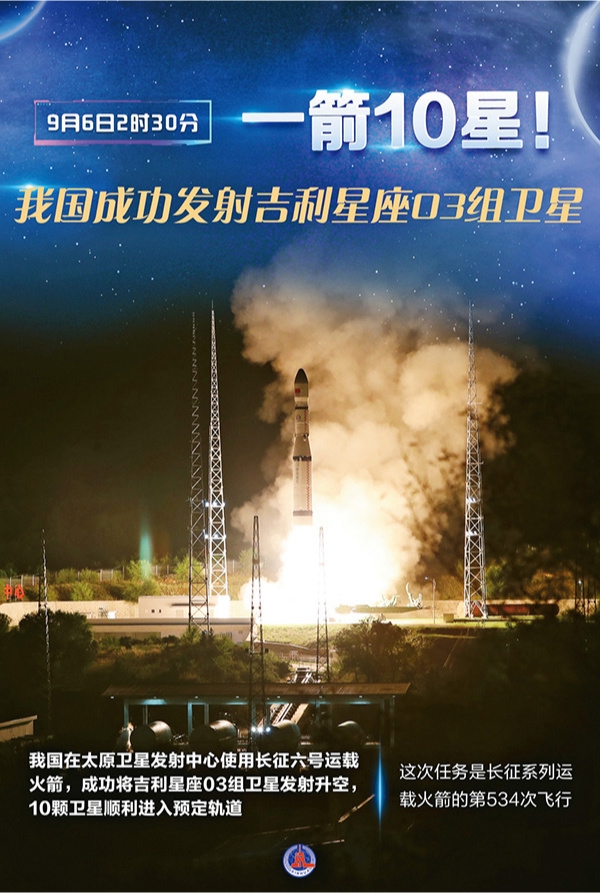 图为2024年9月6日2时30分,我国在太原卫星发射中心使用长征六号运载火箭,成功将吉利星座03组卫星发射升空,10颗卫星顺利进入预定轨道,发射任务获得圆满成功。 新华社发 施鳗珂 安迪/编制