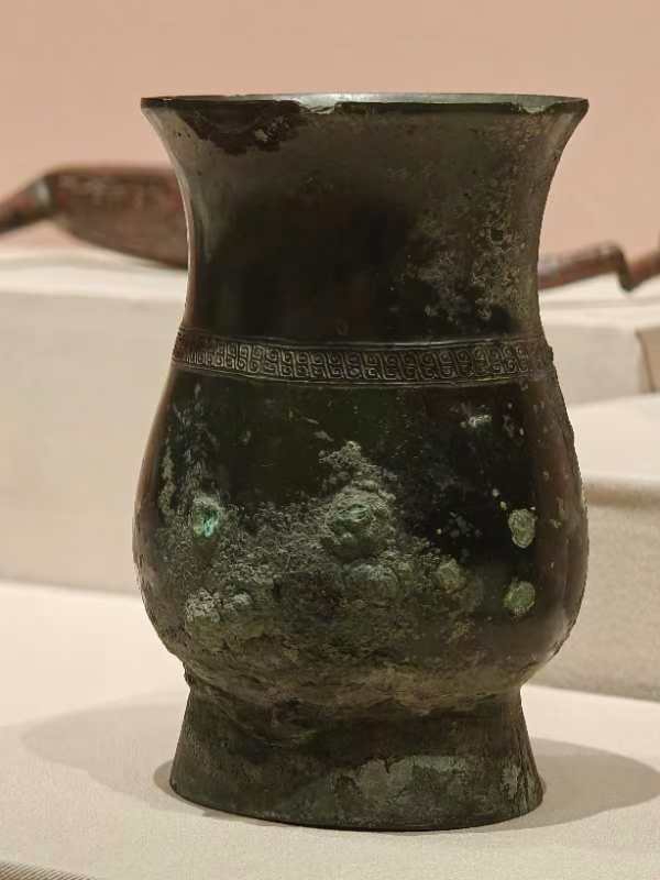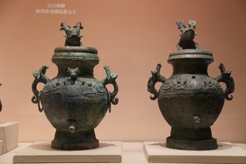 在展览第一单元,四川博物院收藏的青铜器覃父癸铜觯和陕西宝鸡(弓鱼)国墓出土的铜觯看上去极为相似,“有学者认为,四川博物院的这件铜觯,当是商末周初蜀人助周伐纣后,周人对蜀人的赏赐。这些赏赐便极可能由蜀道传入蜀地。”谢丹介绍。有意思的是,四川彭州竹瓦街出土的蟠龙盖青铜罍与湖北、辽宁出土的蟠龙盖青铜罍形制也几乎完全一样。据研究,竹瓦街的蟠龙盖青铜罍当为周人所造,后经蜀道传入蜀地。