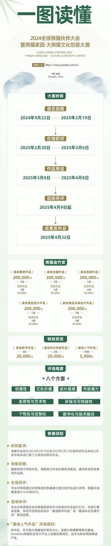 作为“2024全球熊猫伙伴大会”的重要组成部分,由成都市人民政府主办的“熊猫家园·首届大熊猫文化创意大赛”也正式启动,面向全球征集以大熊猫形象或其文化内涵为创作核心的原创作品。据了解,大赛旨在通过每年一届的征集活动,汇聚艺术、文创、潮玩、视频等领域的顶尖专家和头部合作机构,吸引全球优秀的创意机构及个人参与其中,创作出独具创意的作品。