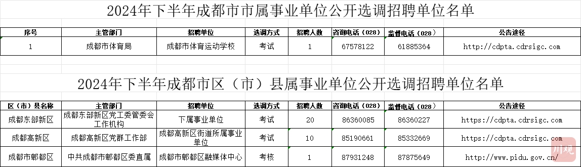 成都市16家市级部门所属事业单位(以下简称市属事业单位)公开招聘95名工作人员,四川天府新区、成都东部新区、成都高新区、青羊区、金牛区、成华区、龙泉驿区、青白江区、新都区、温江区、双流区、郫都区、新津区、简阳市、都江堰市、彭州市、邛崃市、崇州市、金堂县、大邑县、蒲江县21个区(市)县所属事业单位(以下简称区(市)县属事业单位)公开招聘1197名工作人员。详细情况见《2024年下半年成都市事业单位公开招聘单位名单》。