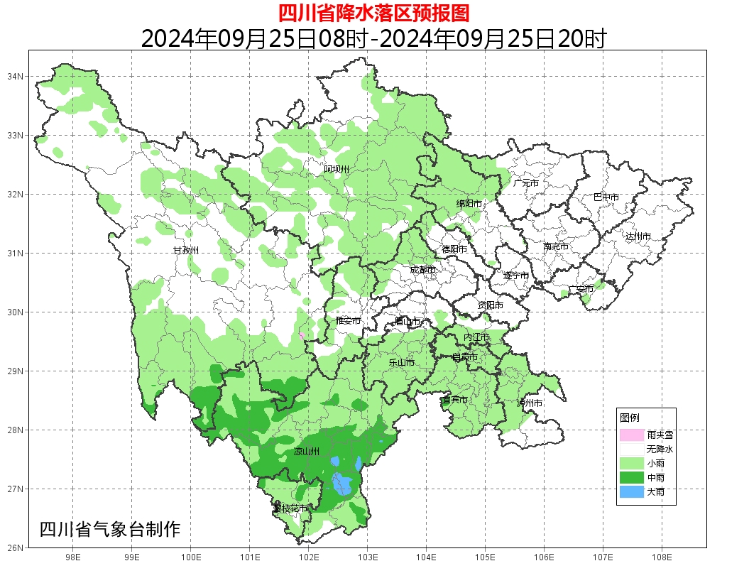 盆地大部多云间阴,其中雅安、眉山、乐山、宜宾、泸州、自贡、内江7市和盆地西部沿山有小到中雨,局部大雨;甘孜州南部多云间阴有小到中雨,局部大雨,川西高原其余地方多云间阴,有分散阵雨或雷雨;攀西地区阴天间多云有阵雨或雷雨,部分地方有中到大雨,局部暴雨。