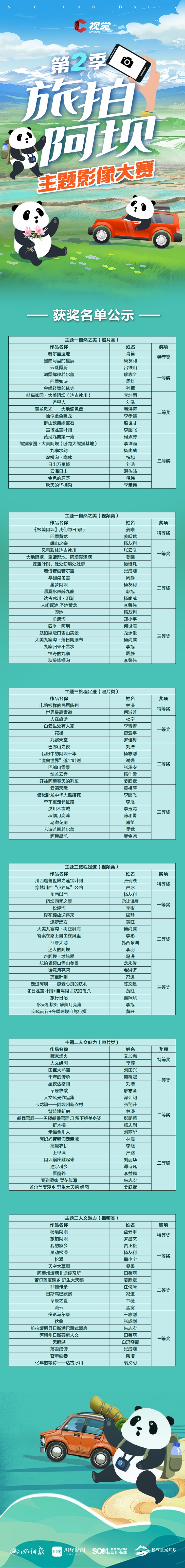 由四川省阿坝州文化广播电视体育和旅游局、四川日报全媒体联合主办,C视觉影像数据库、四川省新闻摄影学会协办的第二季“旅拍阿坝”主题影像大赛有奖征集活动历经6个多月的全网征集与评选,9月24日,评选出的120个影像作品(含三大主题榜单图片及短视频,每个主题设置特等奖4名、一等奖8名、二等奖12名、三等奖16名)进入公示阶段,拟发放奖金近30万元(含税),现将拟获奖名单公示如下: