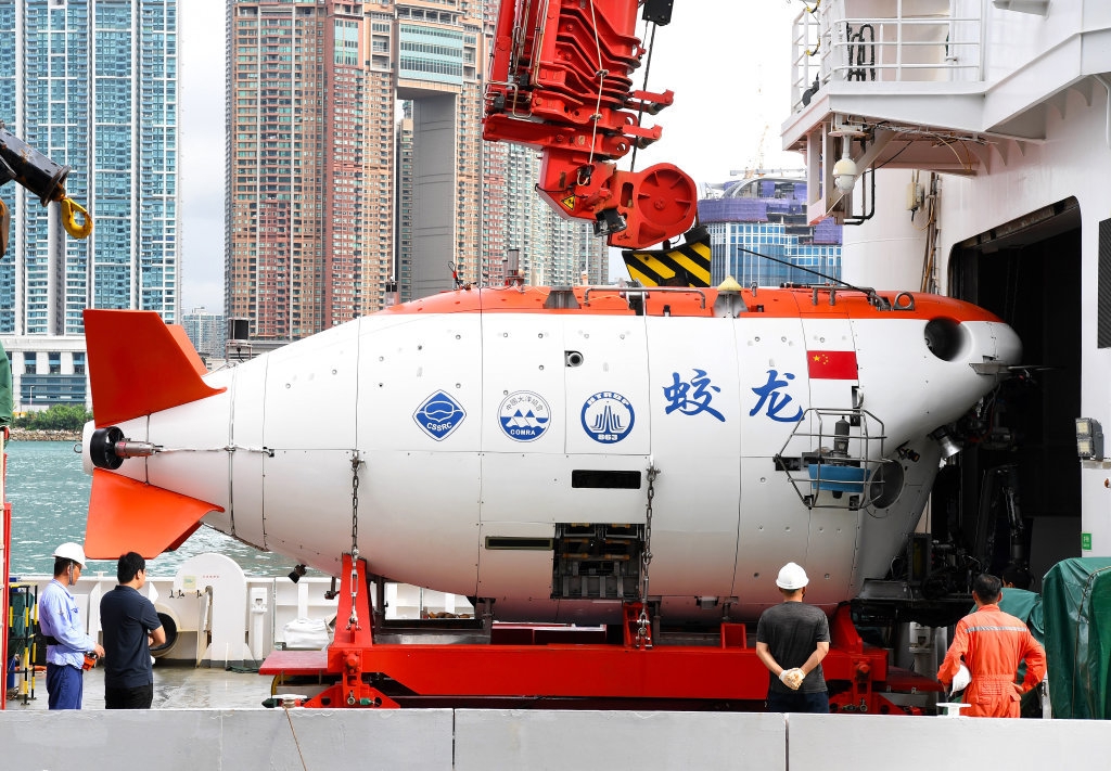 这是停靠于香港尖沙咀海运码头的“深海一号”远洋科考船上的“蛟龙号”(9月24日摄)。
