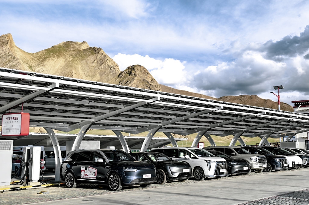 9月2日拍摄的日喀则市珠穆朗玛国家公园北大门停车场内的珠峰光储液冷超充站。