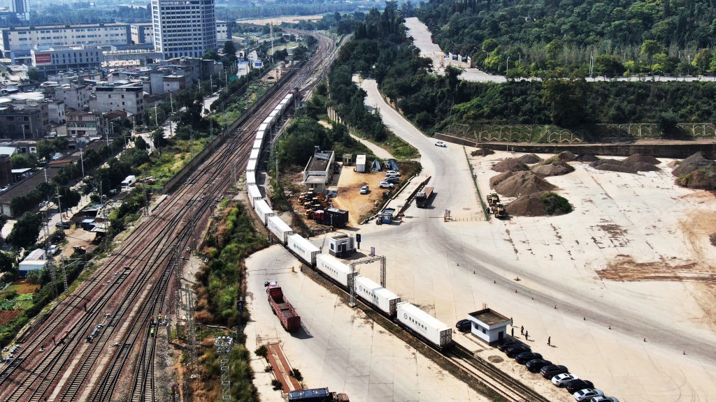 9月24日,首趟中老泰多式联运“一单制”货运列车驶离昆明腾俊国际陆港公铁联运中心(无人机照片)。
