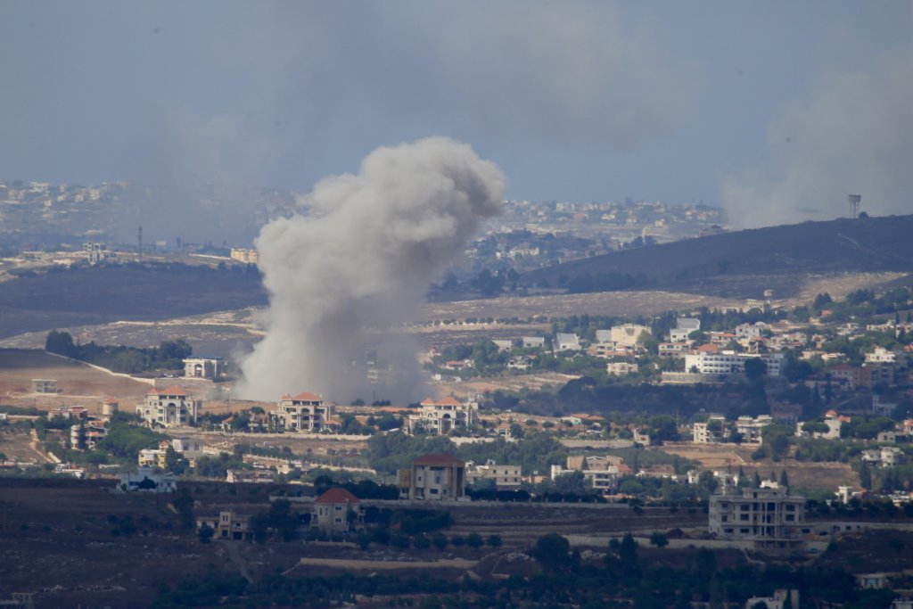 这是9月23日在黎巴嫩迈尔杰云拍摄的以色列空袭黎以边境地区引发滚滚浓烟。
