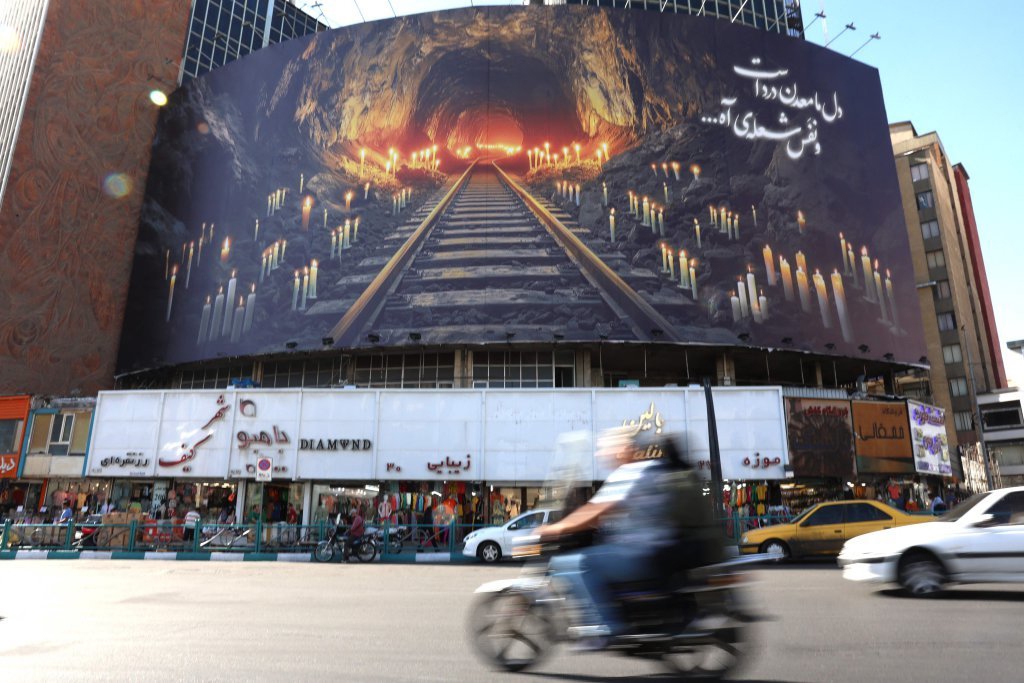 9月23日,在伊朗首都德黑兰,车辆经过纪念遇难者的海报。