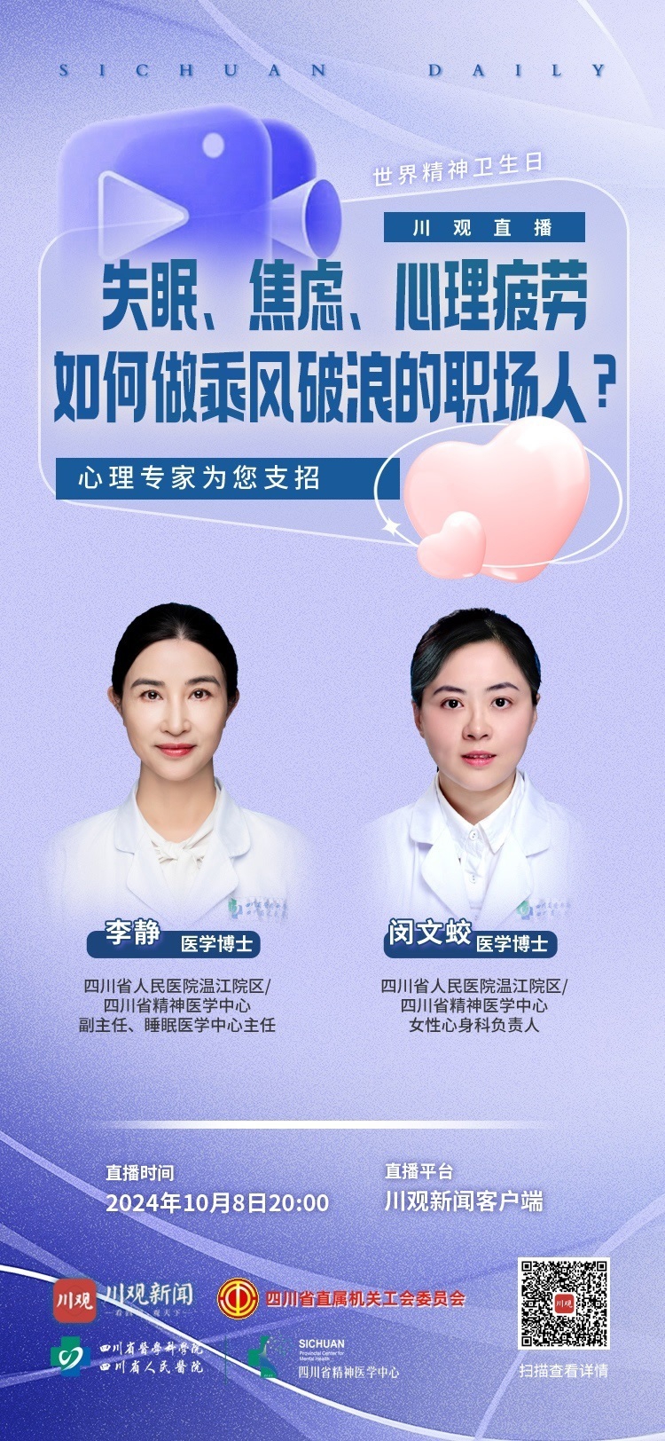 10月8日,川观新闻、四川省直属机关工会委员会、四川省人民医院温江院区/四川省精神医学中心联合开展心理健康主题直播,邀请医院睡眠医学中心、女性心身科两位专家,帮助大家更好地了解缓解职场压力,改善睡眠的方法与策略。