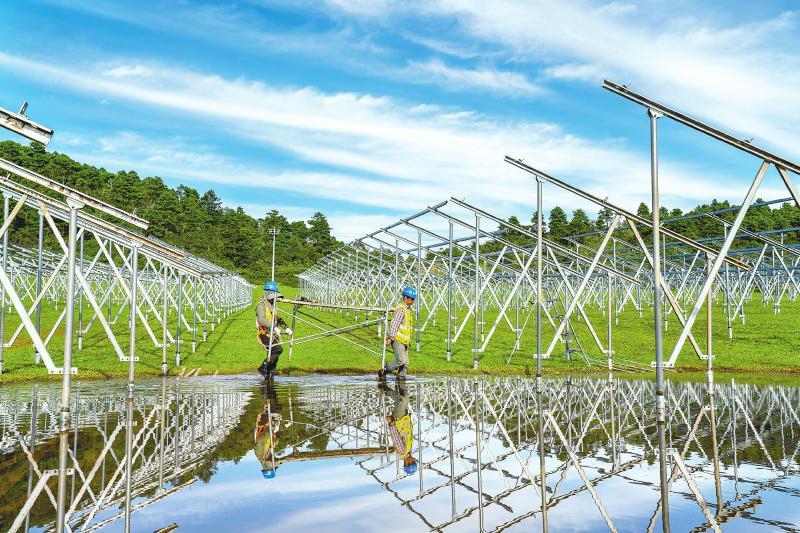 扎拉山光伏电站开展支架安装,该项目是雅砻江流域在建规模最大的新能源项目。谢刚 摄