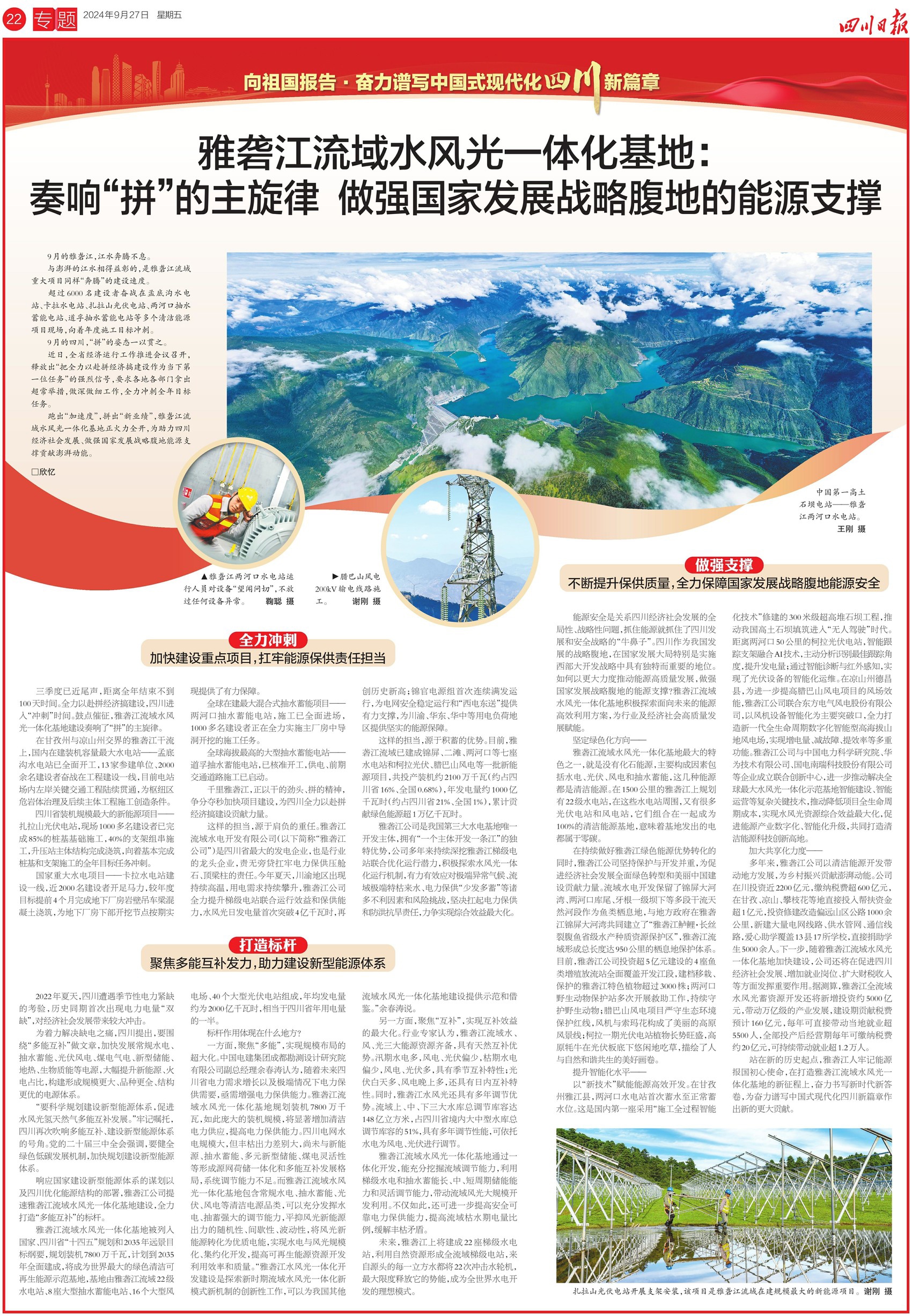 响应国家建设新型能源体系的谋划以及四川优化能源结构的部署,雅砻江公司提速雅砻江流域水风光一体化基地建设,全力打造“多能互补”的标杆。